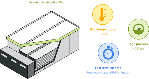 Supercritical Water Gasification recovers up to 90% of energy and valuable resources from high moisture waste, producing only renewable gas, clean water and safe mineral effluent.